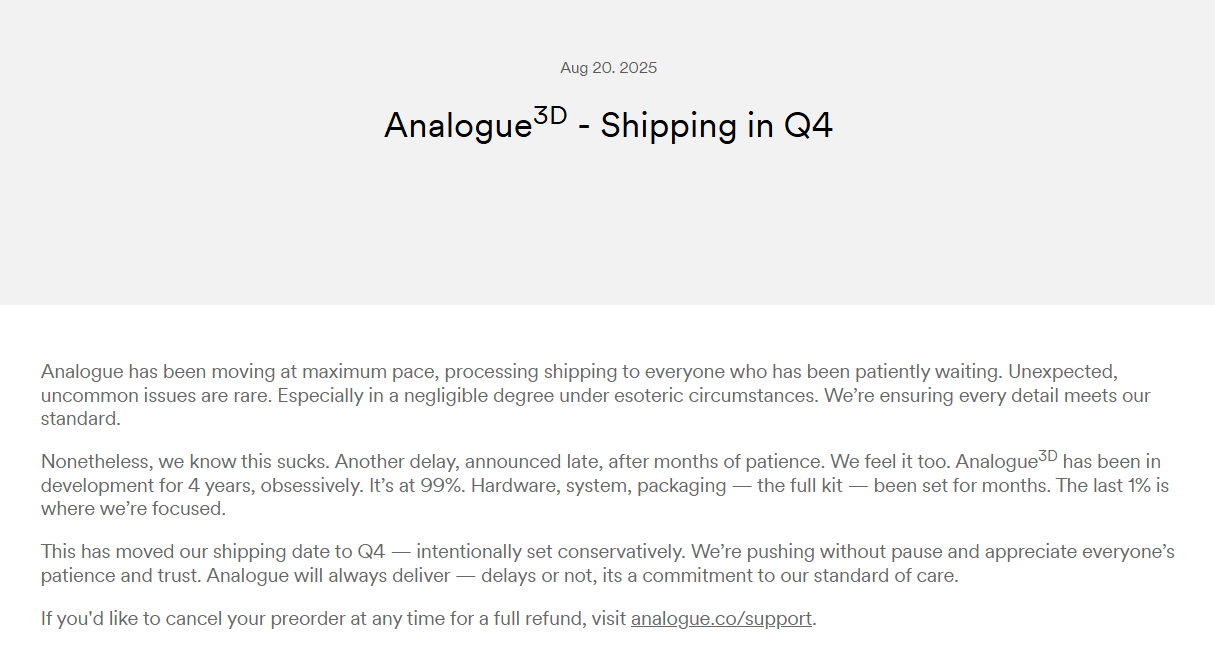 The Analogue 3D has been delayed yet again. Analogue have stated that they are 99% of the way there, and it’s the last 1% that’s taking the longest time to get through. They have acknowledged that it sucks and refund is an option for anyone that does not want to wait any longer. The Analogue 3D is now expected to ship in Q4 2025.