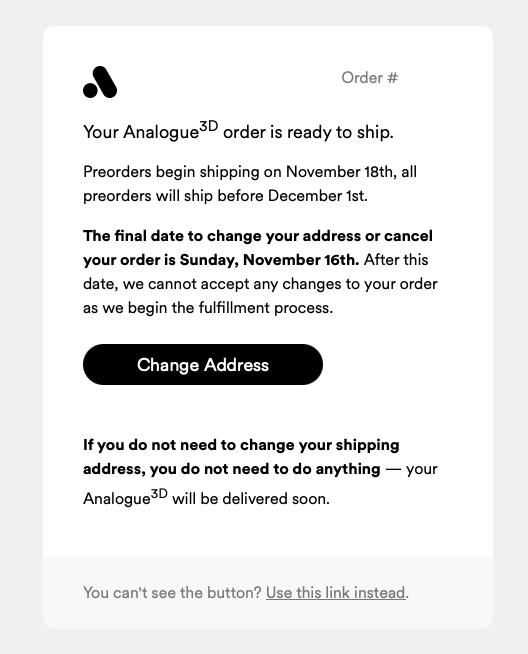 - If your shipping address is correct, no action is required – your Analogue 3D will be delivered soon.