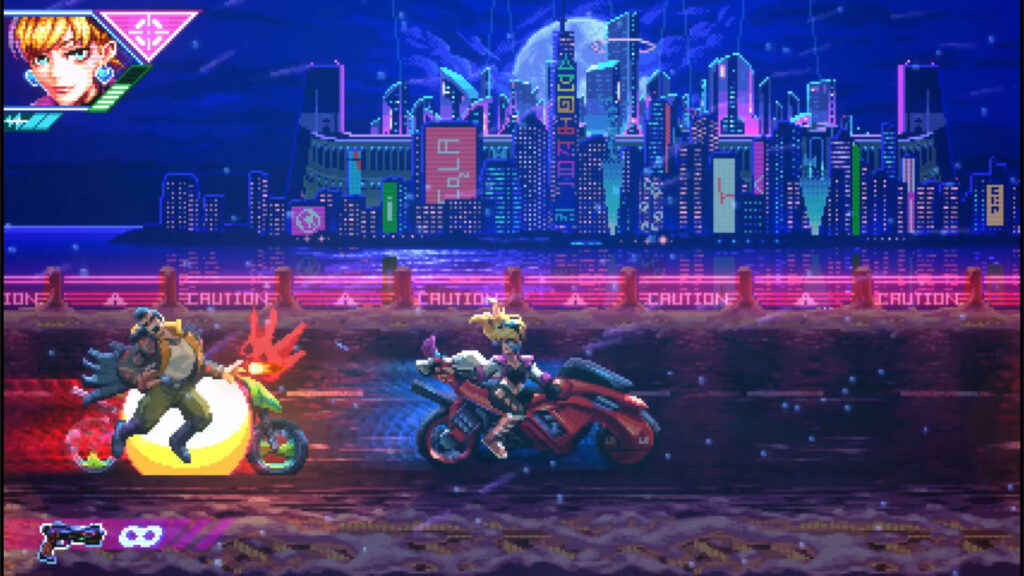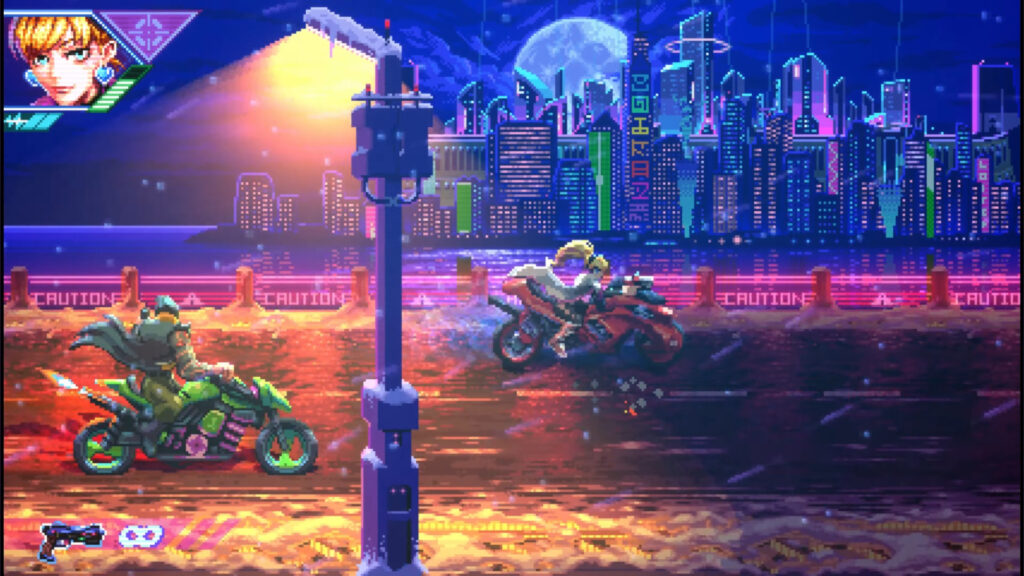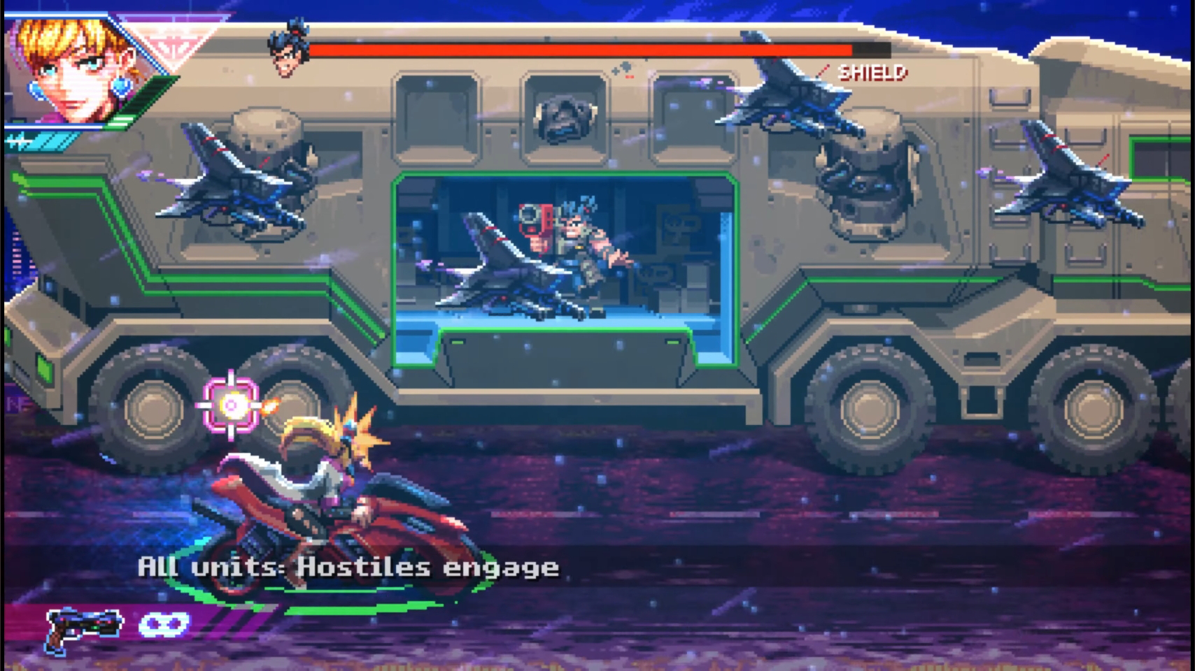 I’ve been playing Neon Inferno, and it has instantly become my favourite game. The pixel art, the colours, and the animation are second to none. The game combines titles like Contra/Metal Slug with the likes of Cabal/NAM-1975. Crucially, you don’t have separate set pieces of the two genres; they are combined into one, and it works amazingly well.