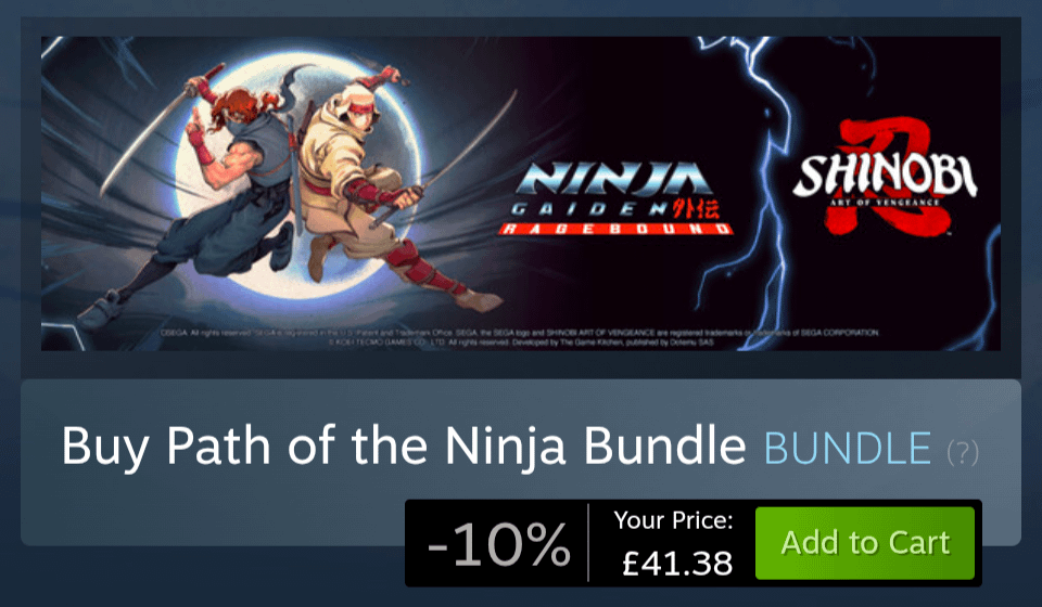We all remember the day Ninja Gaiden: Ragebound dropped, SEGA released the Shinobi: Art of Vengeance demo. Which was definitely a bit of a troll. What’s nice is seeing both the Ninja games joining forces and offering a combo bundle via Steam for PC players. The bundle will bag you a nice 10% off the price of both.