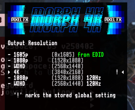 This forces the MiSTer main menu and the listed cores to fall back to standard HDMI output, restoring a clean and usable image while keeping Direct Video enabled for all other supported cores. Gameplay on supported cores remains unaffected and continues to benefit from Direct Video when routed through the Morph 4K.
