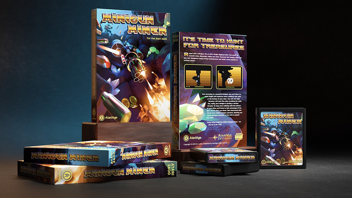 Minigun Miner – along with a fresh lineup of brand-new Atari 2600, 7800, and Jaguar titles – debuts October 17 at the Portland Retro Gaming Expo. The games will also be available to order the same day on AtariAge.com.